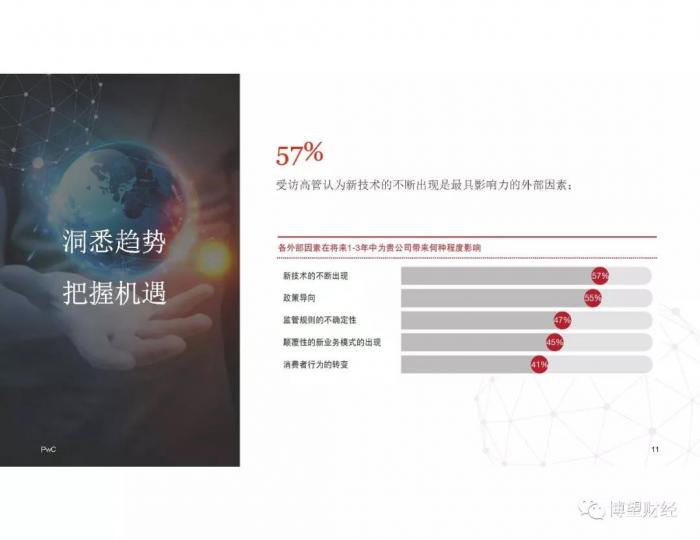 57%和45%的受访企业高管们将“新技术的不断出现”和“颠覆性业务模式的出现”选为影响公司的首要外部因素。