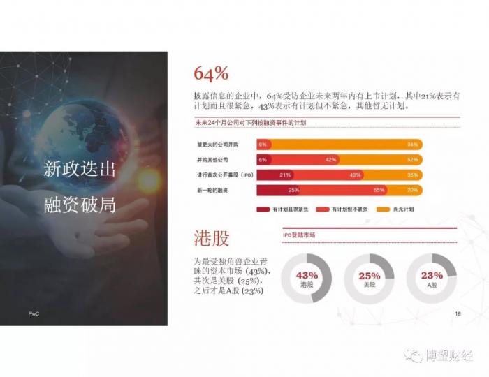 独角兽的崛起离不开资本。调研发现,64%的受访企业未来两年内有上市计划,而最受独角兽企业青睐的资本市场首先为港股(43%),其次是美股(25%)和A股(23%)。适时的政策面辅助也为独角兽创造了上市良机,证监会正在加速改革A股上市制度以吸引海外上市的独角兽回归,CDR(中国存托凭证)系列细则逐步落地,此前港交所推出的“同股不同权”机制对独角兽也颇具吸引力。