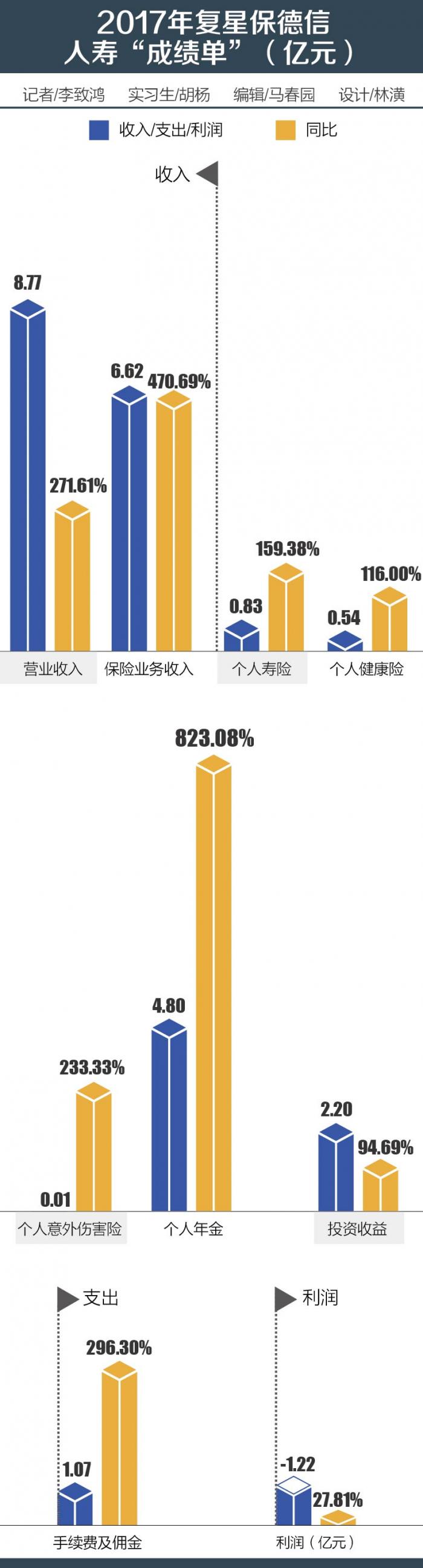 在投资方面,2017年,复星保德信人寿投资收益2.2亿元,同比增长94.69%。整体而言,2017年,复星保德信人寿净亏损1.22亿元,较2016年净亏损1.69亿元,同比收窄27.81%。