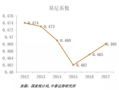 我并不十分看好消费,因为消费增速是回落的。为什么会回落?一方面是经济增速在回落,另一方面是基尼系数在上升,2016-17这两年,基尼系数都在往上走。