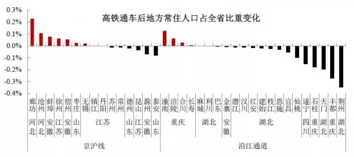 而沿江通道高达70%的城市的比重变化为负值,反映出高铁建成之后,这些城市并没有呈现出集聚人口的态势,反而出现了向外扩散的迹象。
