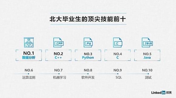 很明显,拥有相关数字技能的高科技人才,在求职市场会有更大优势。而在课程设置方面,北大已捕捉到科技专业与数字技能的“走红”趋势。从技能和素质来看,北大毕业生的顶尖技术类技能位列前五的依次为:数据分析、C++、Python、C、Java。