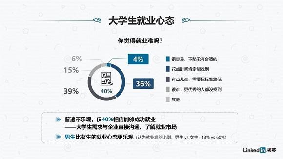 领英5月发布的大学生就业意愿调研显示,对于能否成功就业,学生们的心态并不乐观。仅有40%的学生相信自己能够成功就业,其中,女生比男生的就业心理明显更糟糕一些。48%的男生认为就业比较困难,而这个数字在女生身上的比例高达60%。