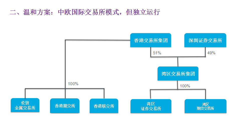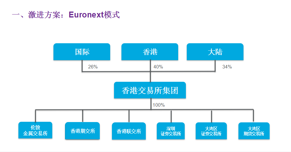 第一种方案其称之为激进方案,参照Euronext模式,可由香港交易所集团收购深圳证券交易所,再针对湾区企业,在香港交易所集团下设立大湾区证券交易所和大湾区期货交易所,采取混合所有制。