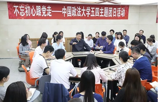 2017年5月3日,中共中央总书记、国家主席、中央军委主席习近平来到中国政法大学考察。这是习近平在学生活动中心参加民商经济法学院本科二年级2班团支部开展的“不忘初心跟党走”主题团日活动。新华社记者王晔摄