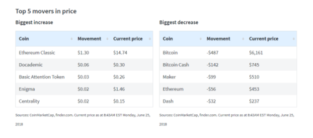据财经网站Finder.com公布的数据,在截至6月25日的一周内,该网站所追踪的1586种数字货币中,超过80%出现价格下跌,平均跌幅达19%。其中,价格下跌最多的是比特币,当周跌近500美元;其次是比特币现金,下跌142美元。