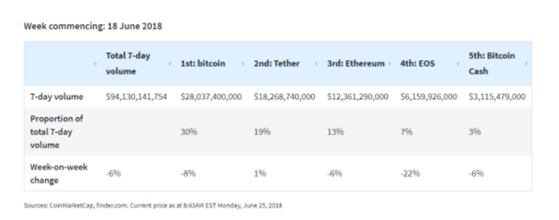 此外,数字货币市场交易量也有所下滑,较前一周下跌了6%。交易量前五大的数字货币,比特币、泰达币、以太币、EOS和比特币现金当周总交易量仅有4月底的一半。与前一周的情况相比较来看,比特币下滑8%,以太币和比特币现金均下滑6%,EOS交易量则暴跌22%。前五大交易币种中只有泰达币“一枝独秀”上涨1%。