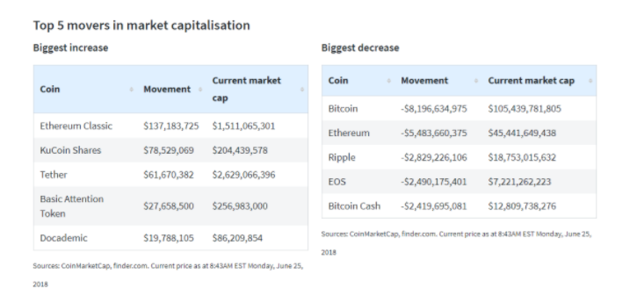 市值方面,Ethereum Classic增长最大,当周共增加1.3718亿美元至15.1106亿美元;而比特币市值下跌最多,共跌81.9663亿美元至1054.3978亿美元。另据Coinmarketcap的数据,6月25日当天,数字货币市场总市值达到2353.3100亿美元,跌破4月初以来的最低值。