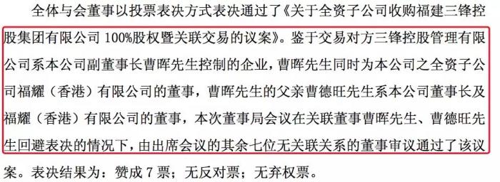 由于三锋控股是曹晖所控制的企业,曹晖也是福耀玻璃副董事长、福耀(香港)有限公司的董事,父亲曹德旺是福耀玻璃董事长及福耀(香港)有限公司的董事,因此福耀玻璃的该笔收购也形成了关联交易。