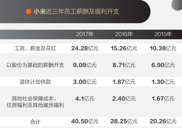 互联网企业高速增长,给员工的工资是否也同步增长了呢?以小米为例,2017年雇员工资、薪金和花红(红利)开支共计24.28亿元(除去社会保障福利、住房福利等),相当于每位员工的年均年薪为16.73万元。