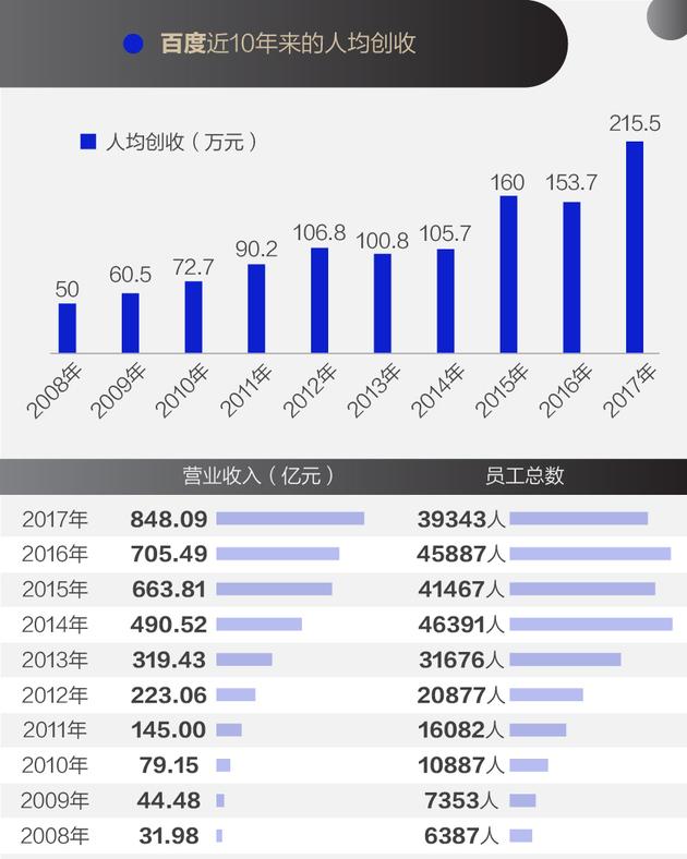 从员工人均创收这个指标,还可以看出一家老牌互联网企业是不是继续保持着增长势头。以百度为例,其人均创收从2008年的50万元增长到2017年的215万,搜索巨头宝刀未老。