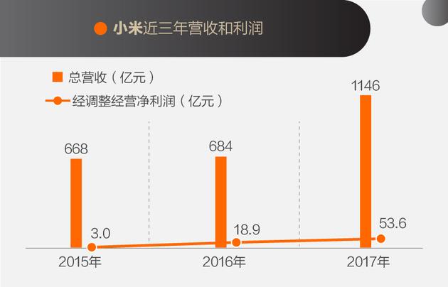 小米近三年的增长轨迹也不弱,2016~2017年总营收增长了67%。利润更是惊人,2015~2016年增长了530%,2016~2017年增长了183%。