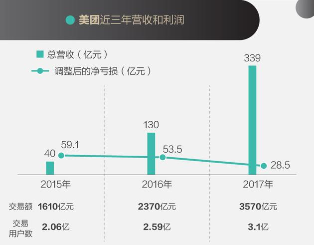 美团其实并不弱。从下表可以看出,2015~2016年美团总营收增长了225%,2016~2017年总营收增长了160%!调整后的净亏损也逐年减少。