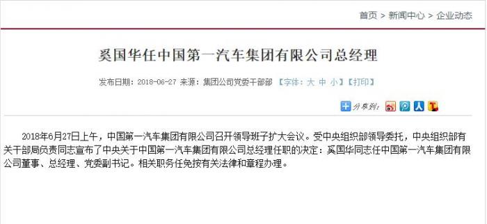 6月27日中国第一汽车集团官网消息:27日上午,中国第一汽车集团有限公司召开领导班子扩大会议。受中央组织部领导委托,中央组织部有关干部局负责同志宣布了中央关于中国第一汽车集团有限公司总经理任职的决定:奚国华任中国第一汽车集团有限公司董事、总经理、党委副书记。相关职务任免按有关法律和章程办理。