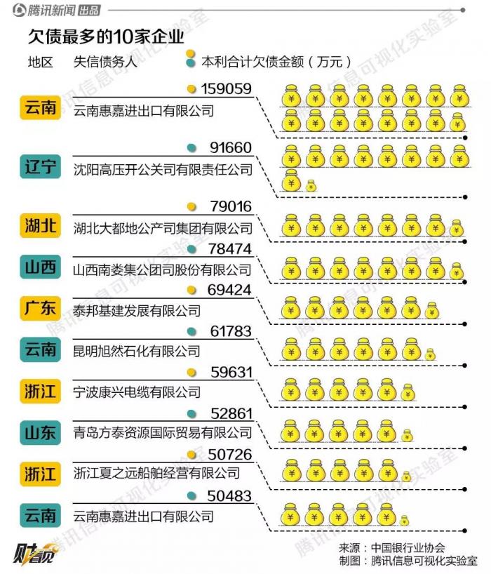 这140家中,涉及金额最大失信债务人,即为上述的云南惠嘉进出口有限公司,金额最小的是宣威市大禹经贸有限公司,其拖欠本息也有728万元。