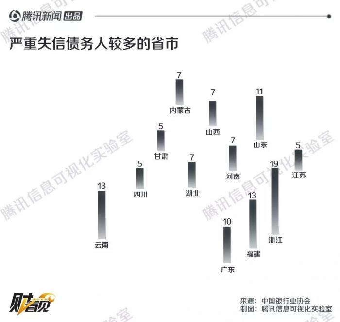 腾讯信息可视化实验室统计发现,公告中有12省严重失信债务人超过5家,其中最多的五个省份分别为浙江、福建、云南、山东和广东,最多的浙江省达到了19家。
