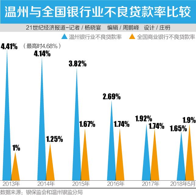 2014年最高峰时,温州银监分局公开的不良贷款率达4.68%。经过近四年化解,不良贷款率持续下降,截至5月末,不良贷款率为1.65%,已经低于全国平均水平0.25个百分点。