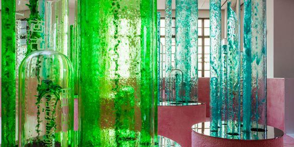 占据了美术馆四楼整个空间的《我的花园》则邀请观众参观一个由玻璃器皿打造的“花园”。地面铺有柔软的粉色地毯,不同直径、高低的粉色花盆内直立着类似植物的玻璃管,玻璃管中喷流着各种透明的绿色液体,同时在玻璃管上印有植物的中文俗名和对应的拉丁语。