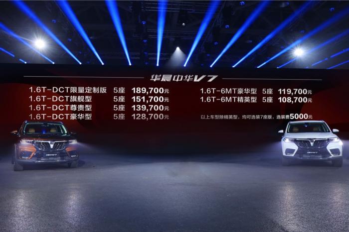 6月29日晚,华晨集团宣布,中型SUV中华V7正式上市。此次华晨集团共推出6款车型,官方指导售价仅为10.87-18.97万元。