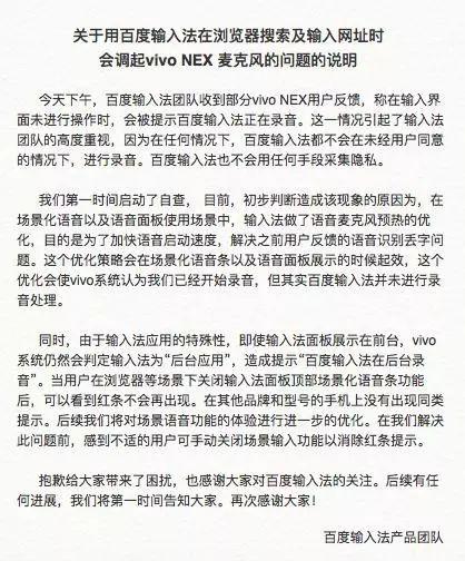 不过,7月1日有部分vivo NEX用户反馈称,使用百度输入法打开手机自带的浏览器进行搜索时,在无任何操作的情况下,手机顶部显示“百度输入法正在录音”,并且会提示用户是否要禁止它。