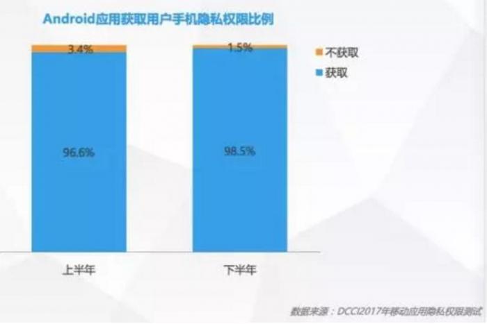 由腾讯社会研究中心联合DCCI互联网数据中心发布的2017年度《网络隐私安全及网络欺诈行为研究分析报告》(以下简称《报告》)显示,2017年下半年,超过80%的手机App会获取用户隐私权限。其中,安卓应用这一数字高达98.5%,苹果应用的这一数字为81.9%。