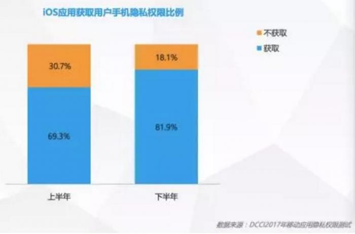 ▲2017年苹果应用获取用户手机隐私权限比例 来源:《报告》