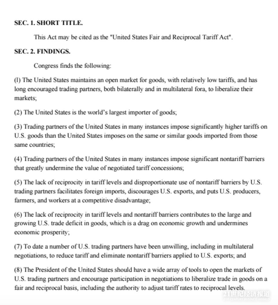 该法案被命名为《美国公平和互惠关税法》,能够让特朗普在无视WTO两项最基本原则的情况下,与任何国家进行一对一谈判。