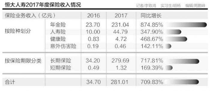 面对上述数据,不禁要问:恒大人寿的保险业务收入以保障型为主,还是以理财型为主?2017年,恒大人寿长期保险收入279.69亿元,同比增长717.81%;短期保险收入1.32亿元,同比增长169.39%。