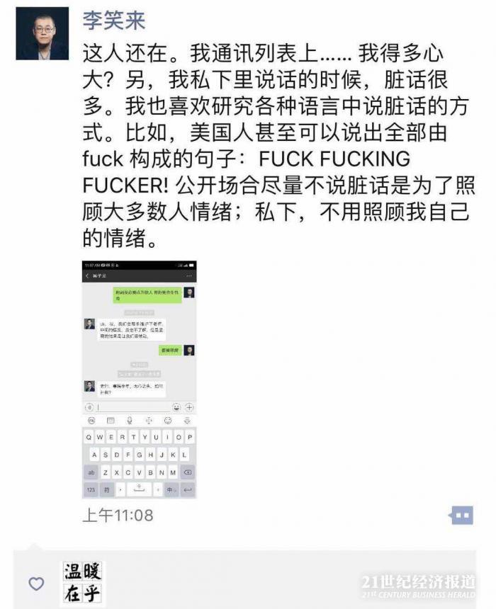 李笑来则表示,“这人还在,我通讯列表上……我得多心大?另,我私下里说话的时候,脏话很多。我也喜欢研究各种语言中说脏话的方式。(xxxx)公开场合尽量不说脏话是为了照顾大多数人情绪;私下,不用照顾我自己的情绪。”
