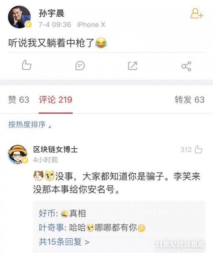 锐波(Ripple)创始人孙宇晨在认证微博上称“听说我又躺着中枪了”。而热门评论中有人回复:“没事,大家都知道你是骗子。李笑来没那本事给你安名号。”得到许多网友点赞。