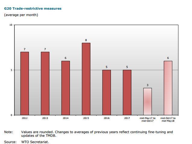 在2017年10月中旬至2018年5月中旬期间,G20国家施行的上调关税、收紧海关手续等贸易限制措施新增达39项,相当于月均采取6项新措施,和上一观察阶段2017年5月中旬-10月中旬相比,月均数量翻一番。