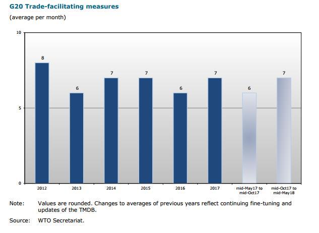(G20国家自2012年以来贸易便利措施的月均新增数量 来源:WTO)