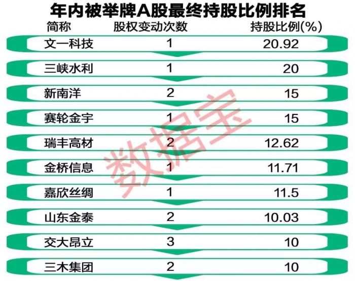 部分股票已经被数度举牌。数据显示,交大昂立年内被中金集团及一致行动人两度举牌,最终持股比例占总股本的10%。此外,山东金泰、瑞丰高材2只股票年内也被两度举牌。