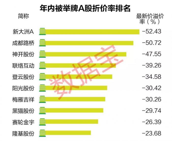具体看,今年1月,新大洲A发布补充公告,去年8月富立澜沧江十四号私募基金通过大宗交易构成举牌,交易均价8.03元,最新价只有3.82元,折价率超过52%居首。