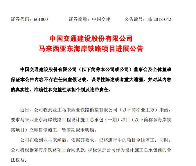 中国交通建设股份有限公司(下称中国交建)7月5日发布公告称,其作为设计施工总承包商的马来西亚东海岸铁路项目已全线停工,暂停期限未明确。