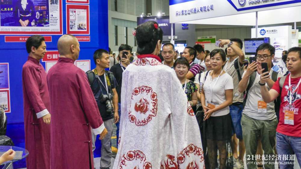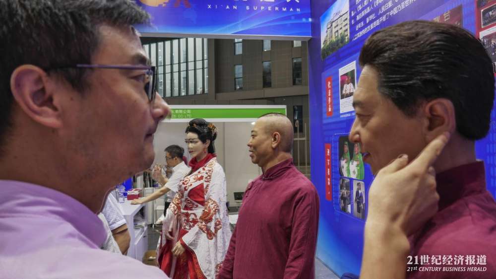 西安一家企业展出的高仿真机器人郭德纲和于谦吸引了观众的眼球。