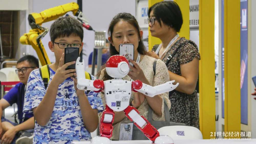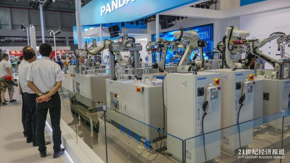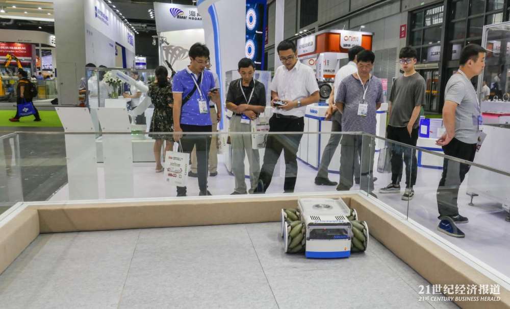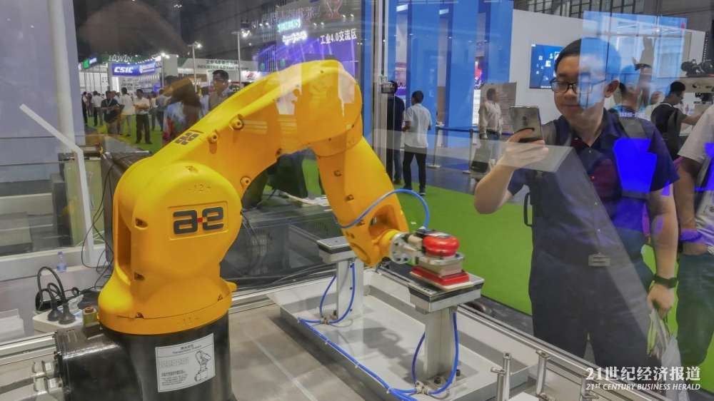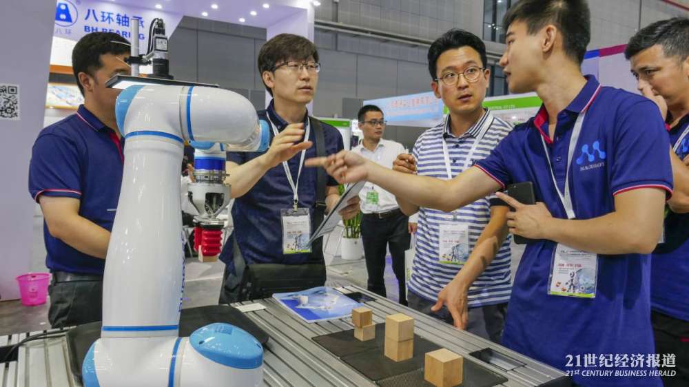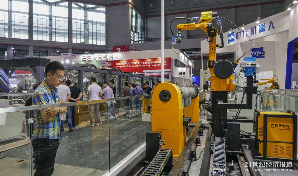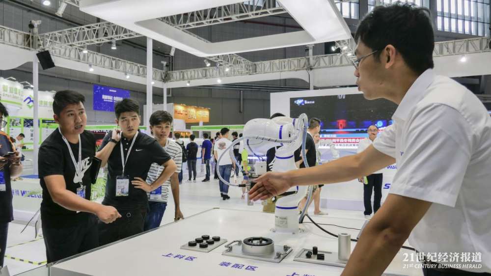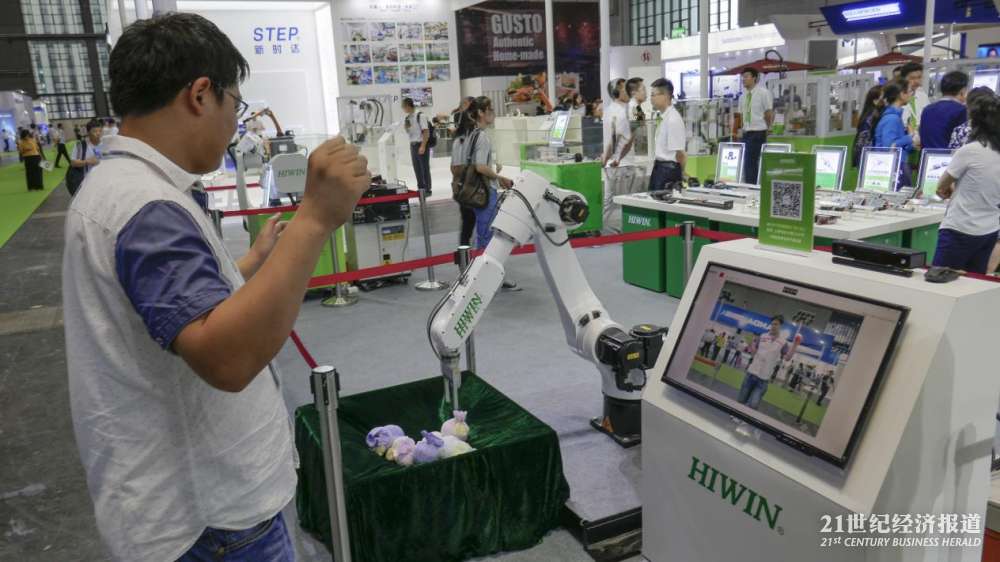 观众观察车床机器人如何工作。 据悉,今年国家统计局公布的行业数字来看,行业景气度较高,今年以来,中国工业机器人产量持续增长,3月份增速在35%左右。而据中国机器人产业联盟今年6月对会员展开的问卷调查表明,38.7%的被调查企业认为,2018年全年销量同比增速将超过20%,而超过29%的企业认为,未来三年,预期销售增速将超过20%。