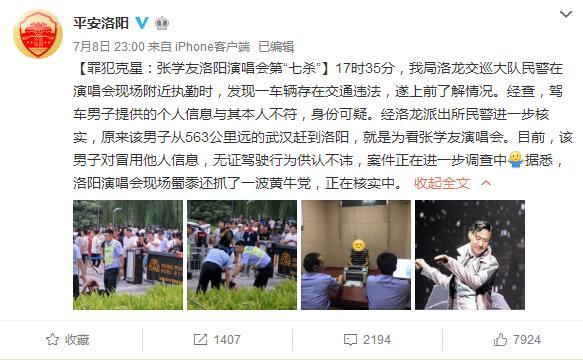 7月8日,张学友洛阳演唱会前,民警发现一车辆存在交通违法,经查,驾车男子冒用他人信息,无证驾驶。