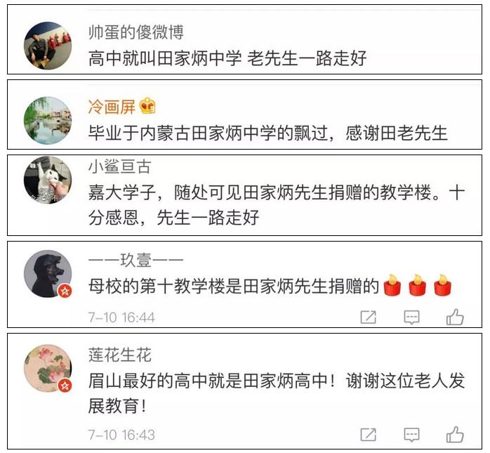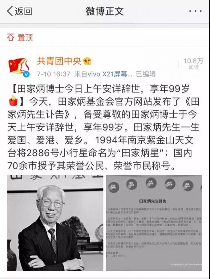 7月10日上午,田家炳基金会官方网站发布了《田家炳博士讣告》,一生致力于支持国家教育发展的田家炳博士于7月10日上午安详辞世,享年99岁。