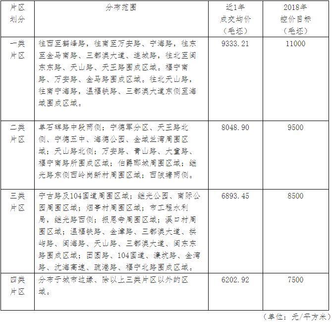 中心城区新建商品住房均价在2018年1月份水平(8882元/平方米)的基础上,每年涨幅控制在6%以内,普通高层住宅(毛坯)预售均价实行最高限价,最高控制在11000元/平方米以内,控价目标由宁德市人民政府每年公布一次。