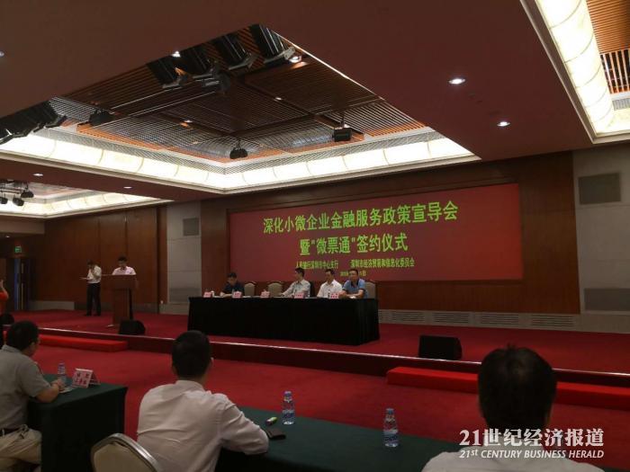 7月11日下午,人民银行深圳中支、深圳市经信委在深圳共同举行“深化小微企业金融服务政策宣导会暨‘微票通’签约仪式”。