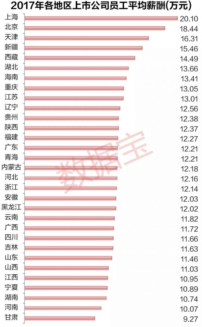 数据宝统计显示,31个地区中仅有4个地区的员工人均薪酬超过15万元。上海是唯一超过20万元的地区,比如从事地产和环保业务的城投控股2017年员工人均薪酬有69.38万元,海通证券平均薪酬63.03万元。北京地区略低,员工平均薪酬为18.44万元。
