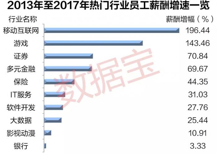 据数据宝统计,以当前相对热门的10个行业为例,银行类公司2017年的最高薪酬在这10个热门行业中处于末位,但是其最低薪酬却排名第一,赚钱效应可见一斑。