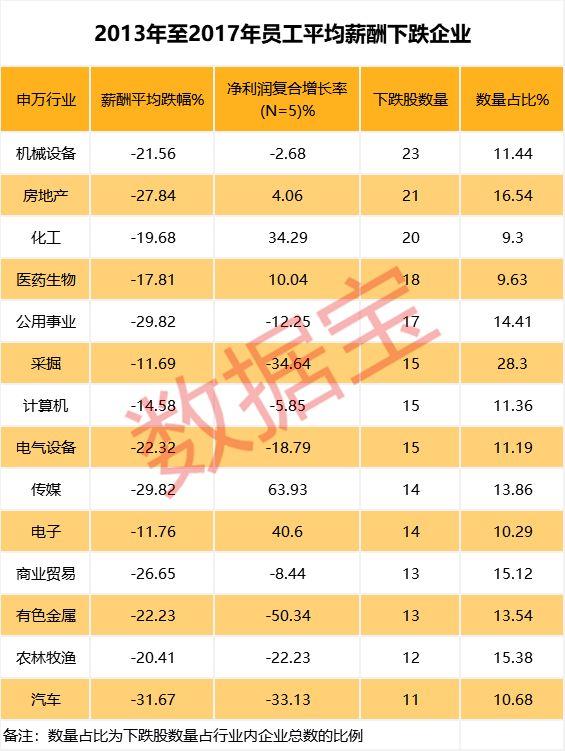 虽然大部分上市公司的薪酬呈上升趋势,但也不乏降薪企业。数据宝统计显示,自2013年至2017年员工平均薪酬下降的企业共有292家,其中传统行业的公司数量较多。