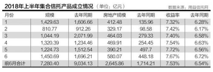 用益信托网数据显示,6月成立集合信托产品规模1450.69亿元,同比下降14.47%;上半年合计成立7280.4亿元,同比下降19.41%。