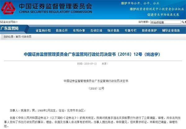 广东证监局于7月9日对姚逸宇做出处罚,判处没收上述违法所得,并处以18.51万元罚款的惩罚举措,罚没金额合计37.02万元。
