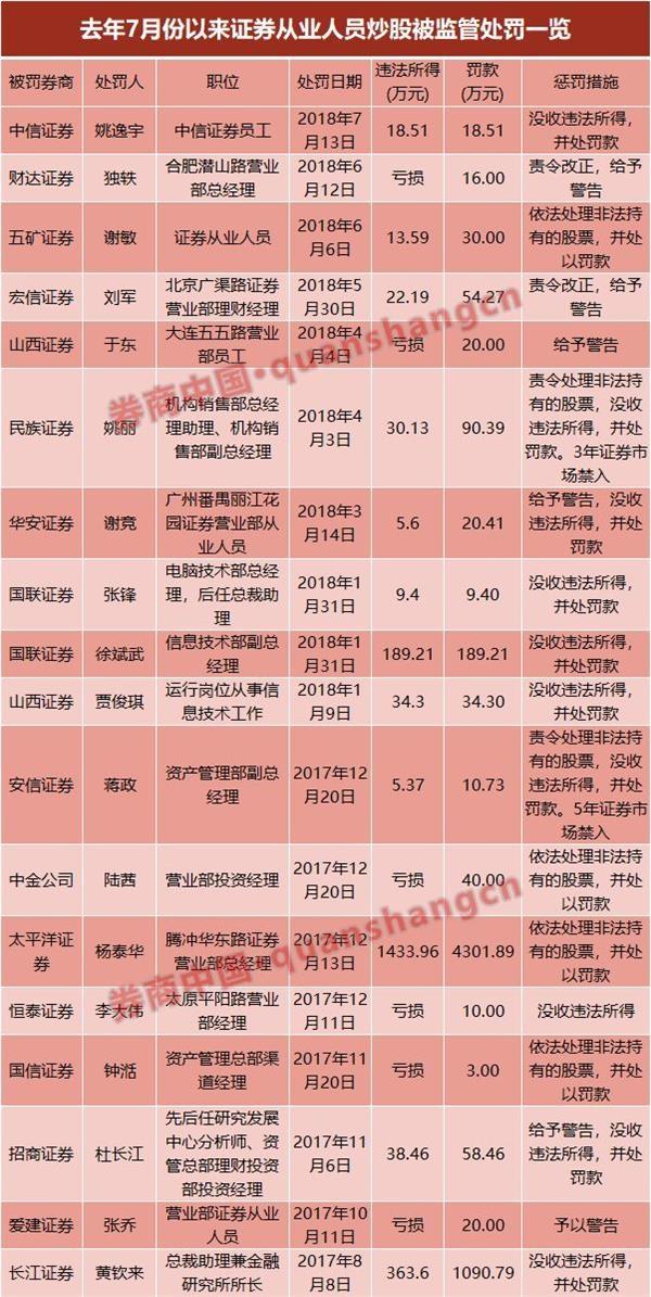 近年来,屡见证券公司从业人员因违规炒股被监管处罚,轻则被罚款,重则被采取证券市场禁入的惩罚举措。