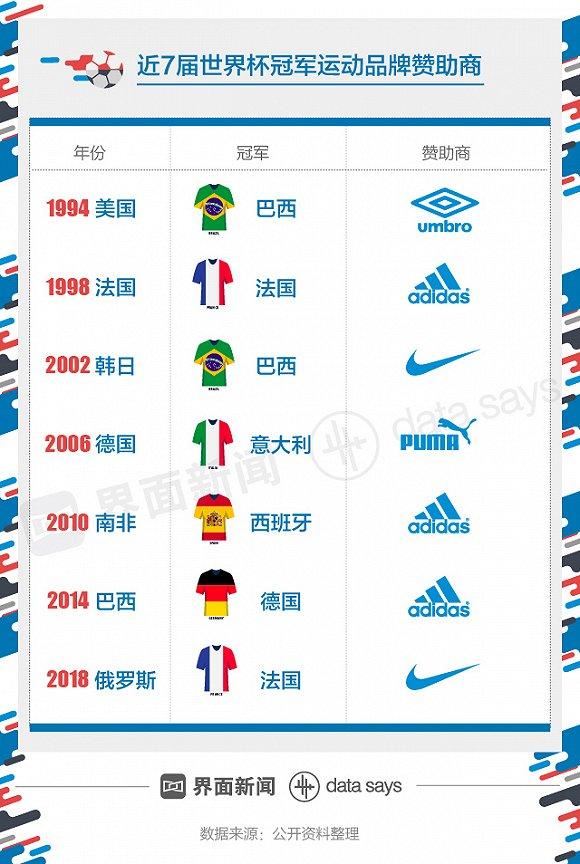 回顾近7届世界杯,阿迪达斯战队曾三次登顶,耐克两次,Puma和Umbro各握有一届冠军。