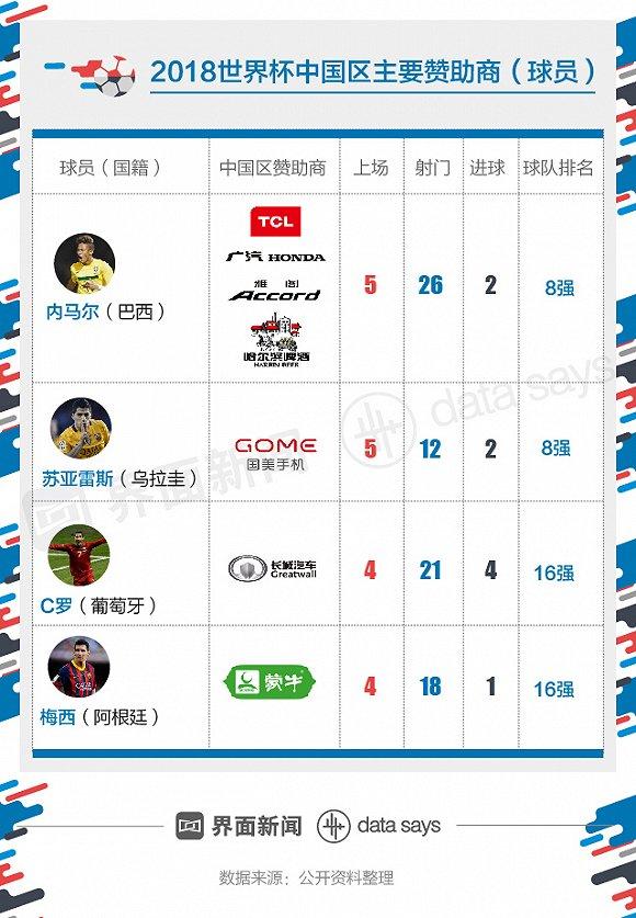 据界面新闻记者此前报道,中国企业在本届世界杯期间的广告支出全球第一,赞助了许多知名球员或球员。