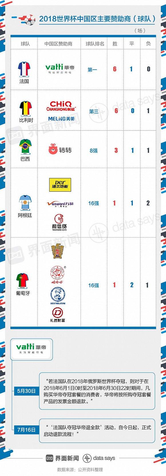球队方面,冠军法国队的赞助商华帝成为最大赢家。华帝曾承诺,如果法国队夺冠,将按所购夺冠套餐产品的发票金额全额退款。7月16日,华帝宣布正式启动“退全款”流程。据悉,此次活动销售总额约7900万元。